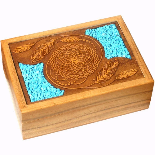 A beautifully detailed laser engraved box featuring real gemstone chips as part of the decoration