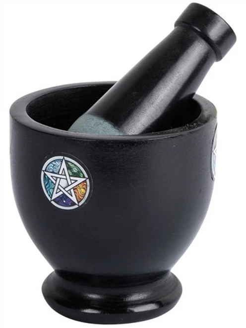 Soapstone pestle and mortar featuring an elemental pentagram decal.