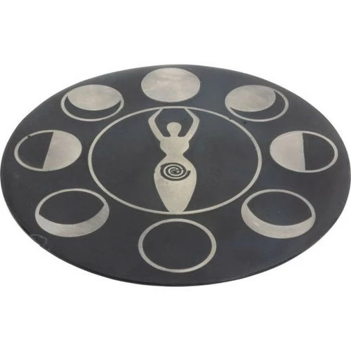 Soapstone Round plate with Silver Inlay – Moon Phases Goddess – has hole for incense or use as an offering plate – 12.7 cm