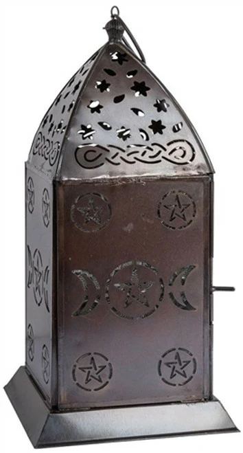 Ornate Lanterns from use with a candle, made of pressed iron with cut out decorations and glass panels.