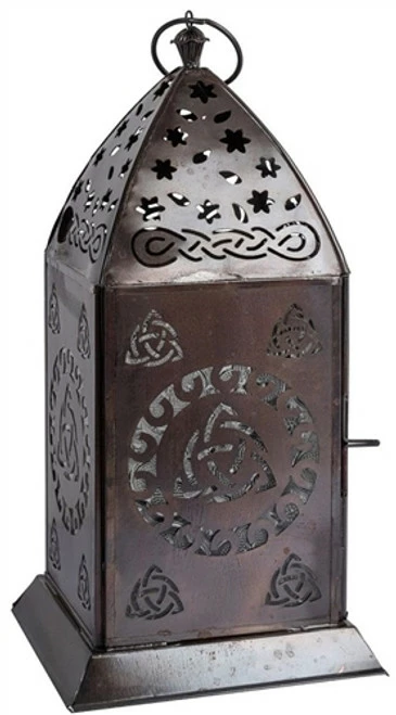 Ornate Lanterns from use with a candle, made of pressed iron with cut out decorations and glass panels.