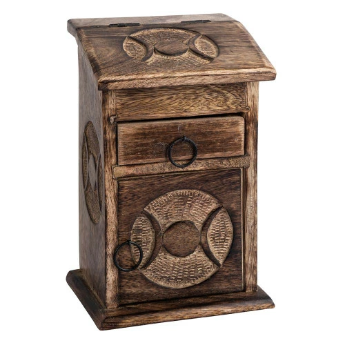 This intricate cupboard with drawer has carved top and sides and is ideal for storing herbs, crystals and other small magickal items.
