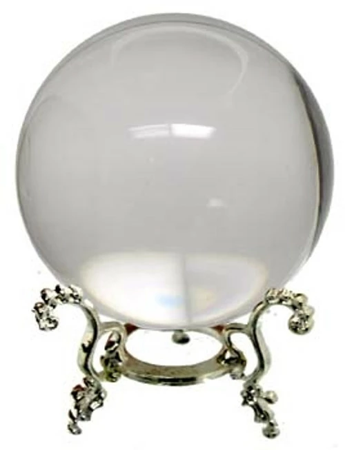 Medium crystal ball 60 mm in diameter (the centre one in the comparison picture) with optional ball stand (medium shown in the pic) smaller plainer ones also available – in three finishes – silver, gold or copper.