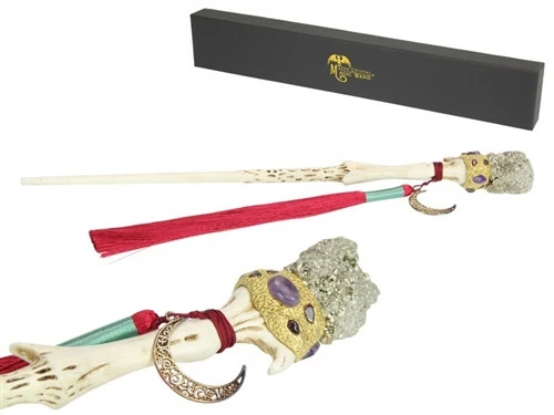 These wands are made of resin so allow a lot of detail – they are hand painted and designed to look like ancient wood this one features a raw pyrite tip, crescent moon charm, and red tassel.