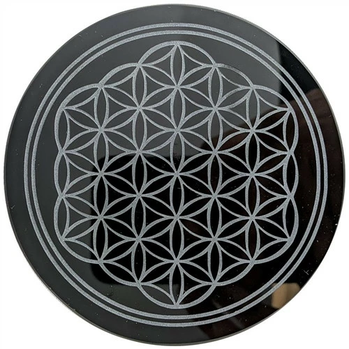 Obsidian disc with an etched flower of life design (sacred geometry symbol)