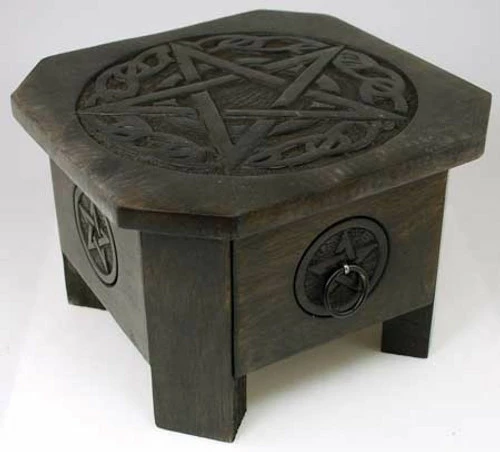 The Celtic Pentagram Altar Table has its own storage space for ritual materials within the small drawer it includes.