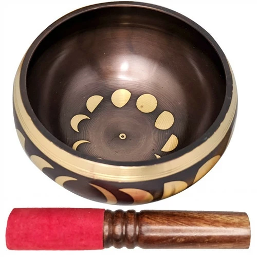 Fancy singing bowl finished with moon phase and eclipse engravings on the interior and a gold print on the exterior. Includes a wooden dowel-striker.