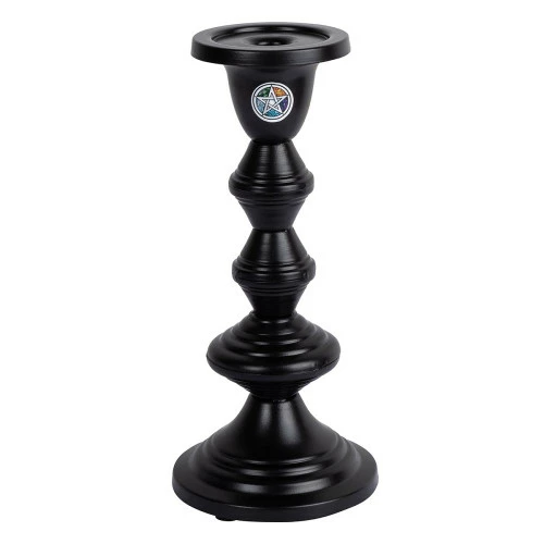 Metal tall candle holder painted black and decorated with a colour decal of the flower of life